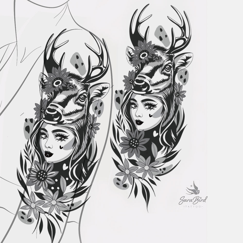 It is with great enthusiasm that we present the latest tattoo project developed by the talented Sara Raquel, from the renowned Sara Bird Tattoo studio. This unique tattoo is a unique representation of a woman with a deer's head over her own head, creating an image that evokes mystery, connection to nature, and spirituality.