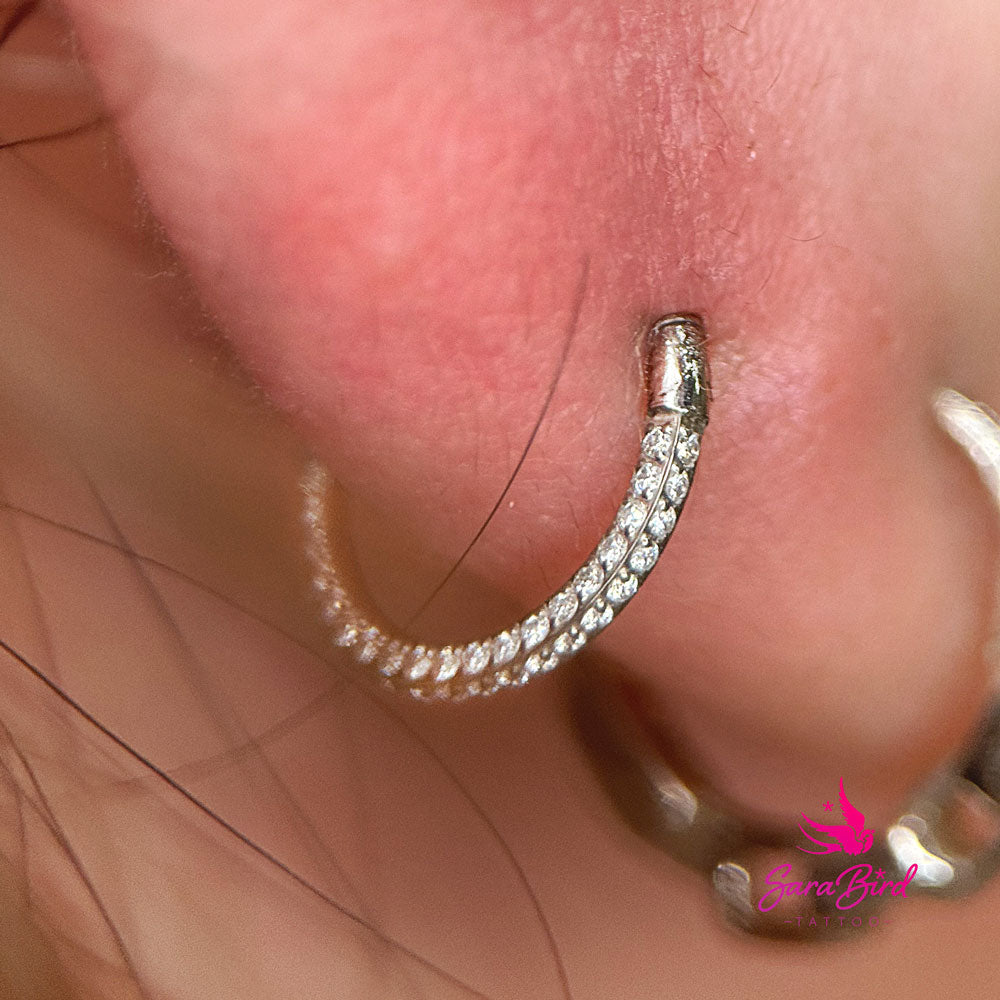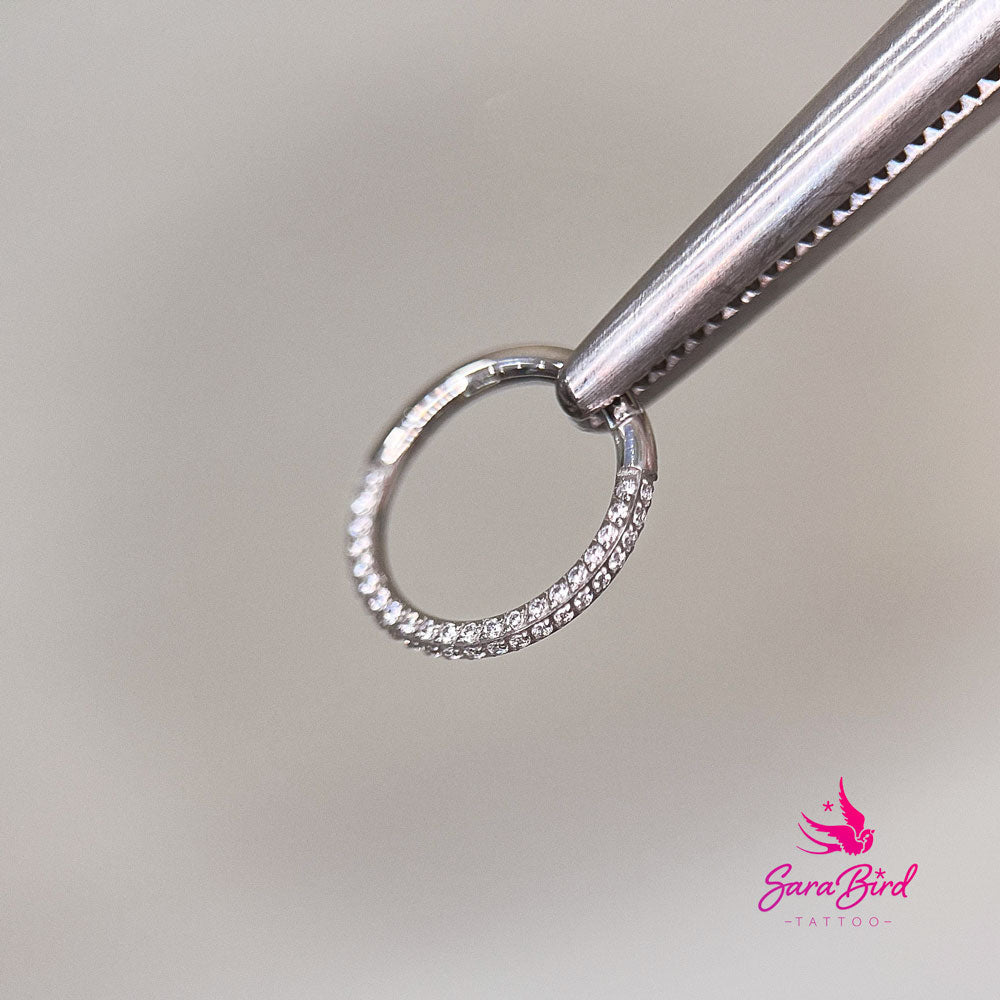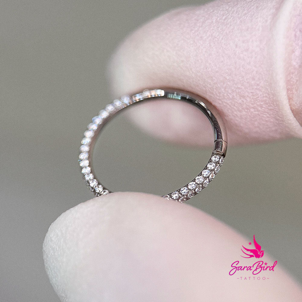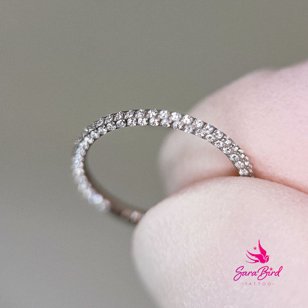 Muestra un toque de sofisticación con nuestro exquisito aro de titanio, adornado con cristales intensamente brillantes en un ángulo de 270º. Esta pieza exclusiva combina la elegancia atemporal con la durabilidad superior del titanio, creando un accesorio de lujo que destaca en cualquier ocasión. Con un delicado grosor de 1,2 mm y un diámetro de 8 mm, este versátil aro es perfecto para embellecer diversas zonas del cuerpo, como las orejas y la nariz.