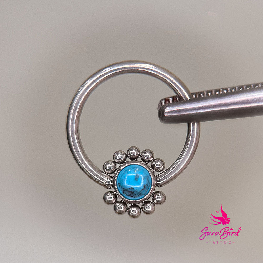 Como un auténtico anillo Cautivo, su cierre está garantizado por la presión de la joya contra el borde del anillo, aportando seguridad y un ajuste perfecto. Fabricada con titanio de alta calidad, esta joyería no solo ofrece un brillo deslumbrante sino que también garantiza resistencia y comodidad para un uso prolongado. El ópalo sintético azul, rodeado de cuentas detalladas, capta la luz de una manera cautivadora, añadiendo un toque de color y elegancia a tu look.