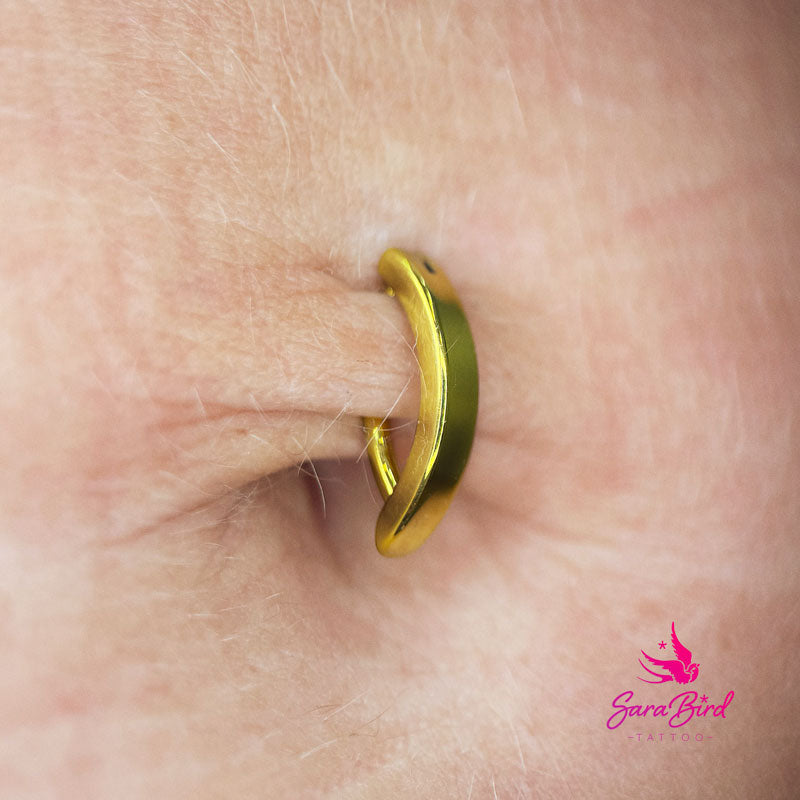 Esta forma exclusiva fue desarrollada para evitar que el anillo sobresalga excesivamente, logrando que quede alineado armoniosamente con la piel, ofreciendo un acabado sutil y sofisticado. Así, la joya no sólo realza la belleza de tu piercing, sino que también proporciona un toque delicado que contornea la zona del ombligo con precisión.