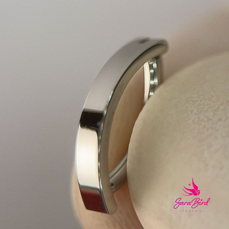 Anillo de Titanio con Forma Especial para Ombligo , una pieza de joyería diseñada para ofrecer un ajuste más discreto y cómodo, sin renunciar a la elegancia. A diferencia de los anillos tradicionales, esta pieza destaca por su diseño ligeramente aplanado, que asemeja la forma de un ojo, proporcionando un ajuste perfecto alrededor de la zona perforada.