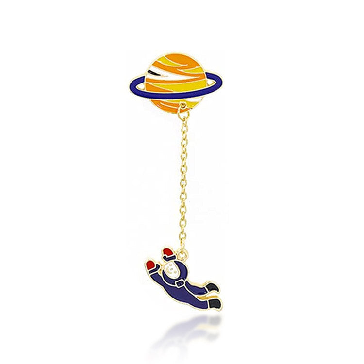 ¿Y esta insignia en forma de planeta con un astronauta? ¿No es bonito? El astronauta está flotando por la cadena de metal dorado conectado al planeta.