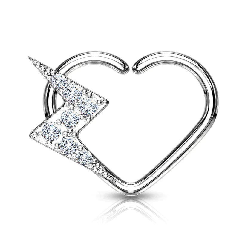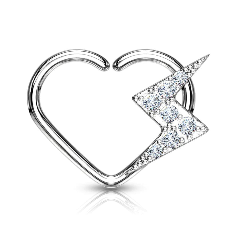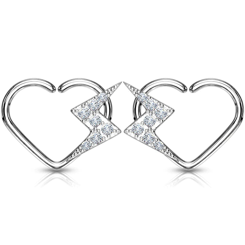 As jóias que vê acima têm a forma de um coração onde metade do coração precisa passar pelo seu piercing. A outra metade foi decorada com um pequeno raio cravejado de pedra. O coração está disponível em duas variantes diferentes, cada uma das quais pode ser selecionada em três cores diferentes. Em outras palavras, este fornece seis combinações. As duas variantes são direita ou esquerda, respectivamente, dependendo da orelha em que perfurou. Se selecionar "Esquerda", as jóias que receber serão para uso na orelha esquerda. O coração é feito de latão e posteriormente colorido em uma das três cores com platina para a versão prata e piso em folha para as outras duas versões, respectivamente. As medidas internas deste coração são de 8 mm de largura por 8 mm de altura. Os raios na frente das jóias são soldados apenas; portanto, quando abre e fecha as jóias, tenha cuidado para não rasgar os raios. Veja se pode abrir o coração com um pequeno toque, sem forçar o raio.