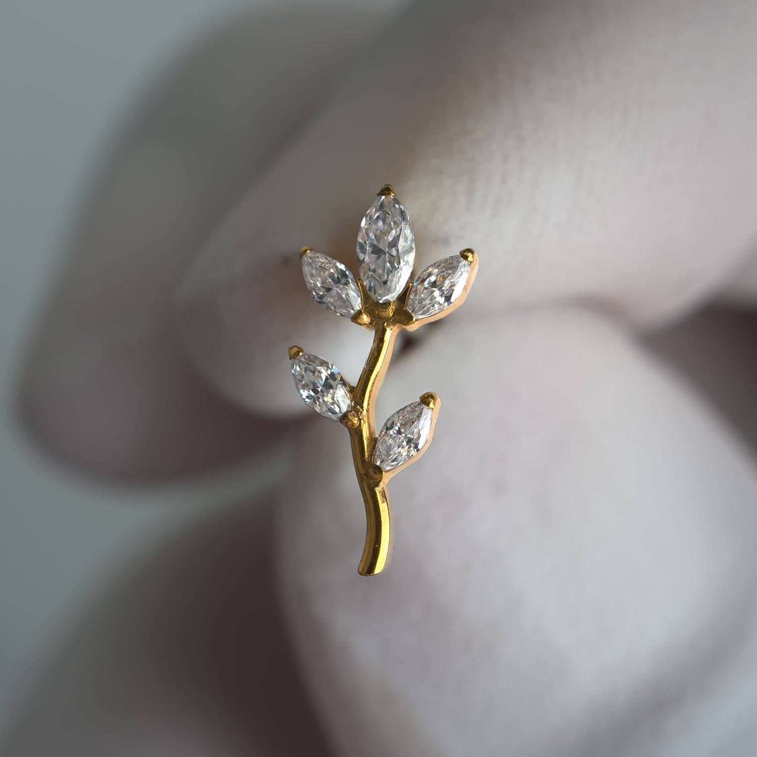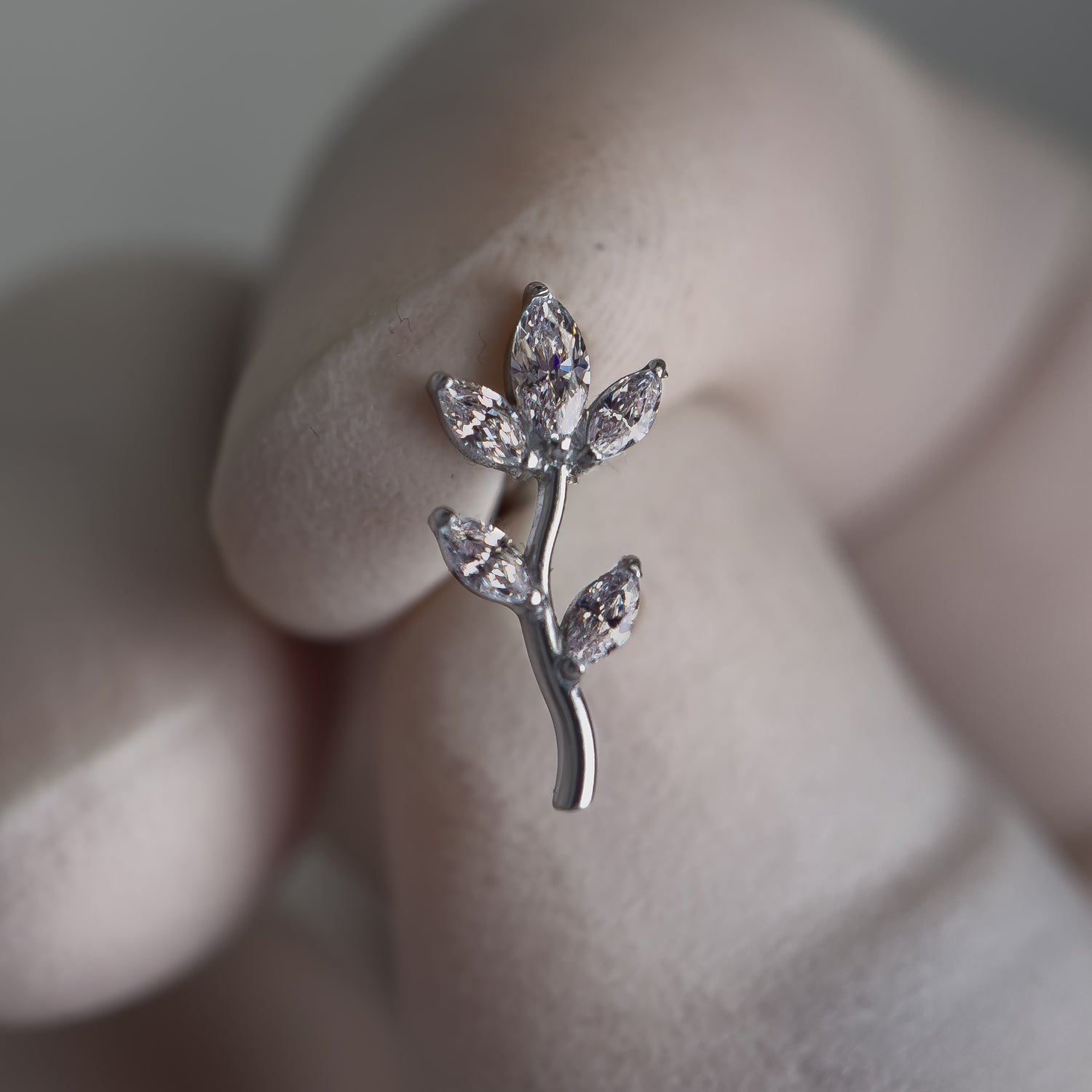 Este deslumbrante topo em titânio de grau cirúrgico destaca-se pelo seu design inspirado na natureza, que combina a elegância de um ramo com cinço folhas e o brilho intenso de cristais de zircónia com lapidação em formato navette. Cada detalhe foi pensado para criar uma peça que é, ao mesmo tempo impactante, e que não passa despercebida.